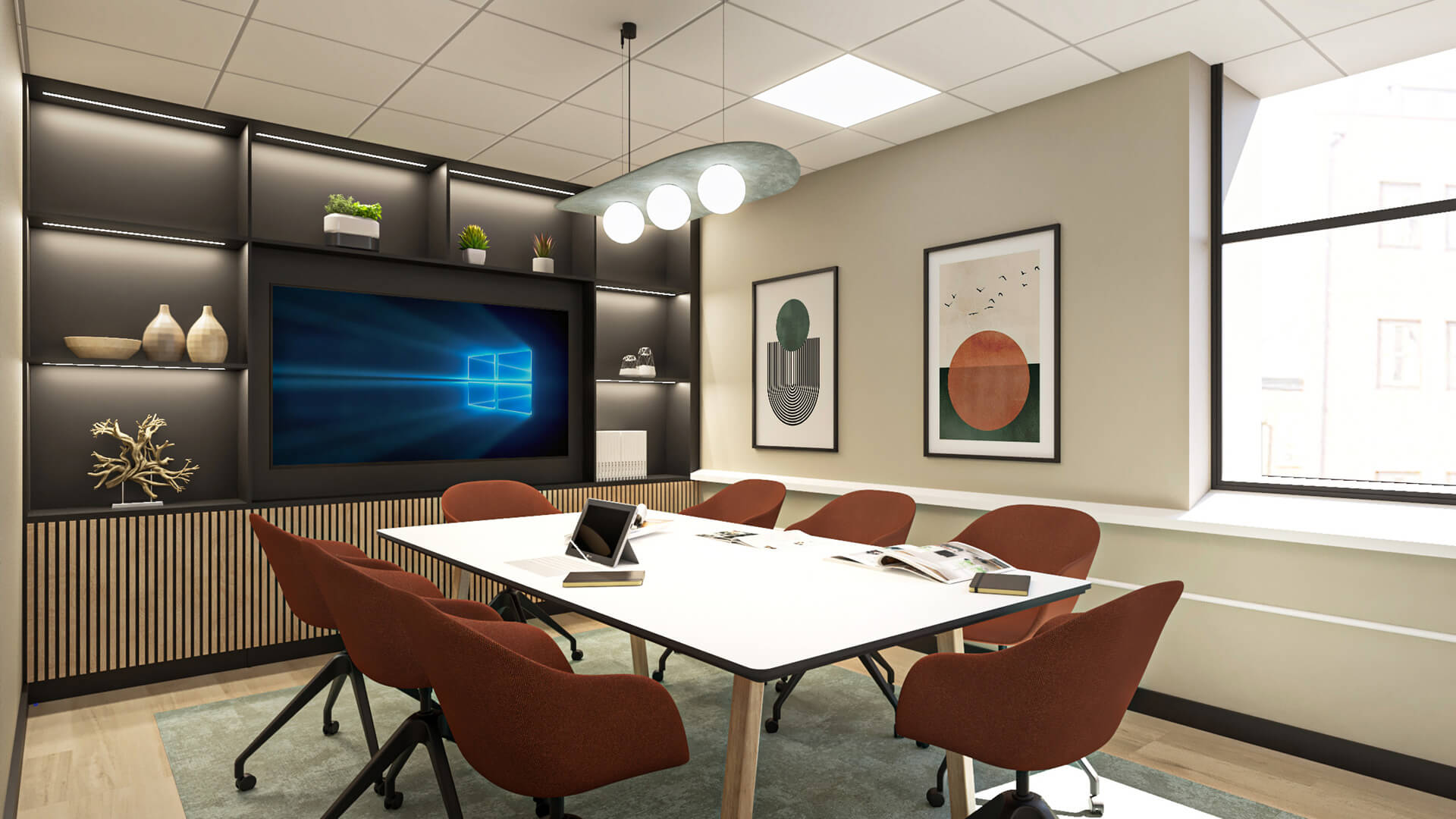 A cosy meeting space tailored for six individuals, equipped with a TV, electric fire, coffee machine, and fridge.